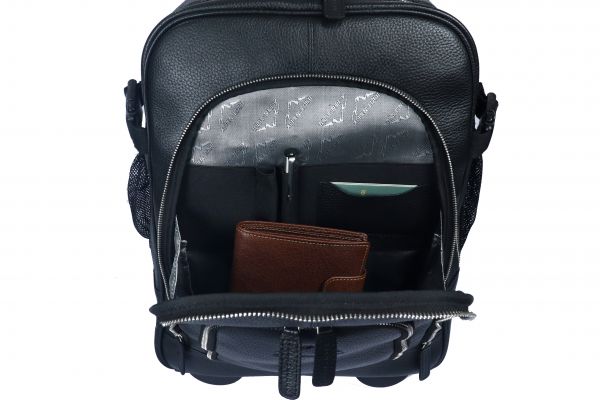 "ACHENSEE" bietet für seine kompakte Größe erstaunlich viel Stauraum. Vor allem die zwei aufgesetzten Taschen, die man sehr weit öffnen kann, ermöglichen einen schnellen und bequemen Zugriff auf Ihren Inhalt. In der größeren befinden sich Stiftehalter, Visitenkartenfach und zwei weitere Fächer.