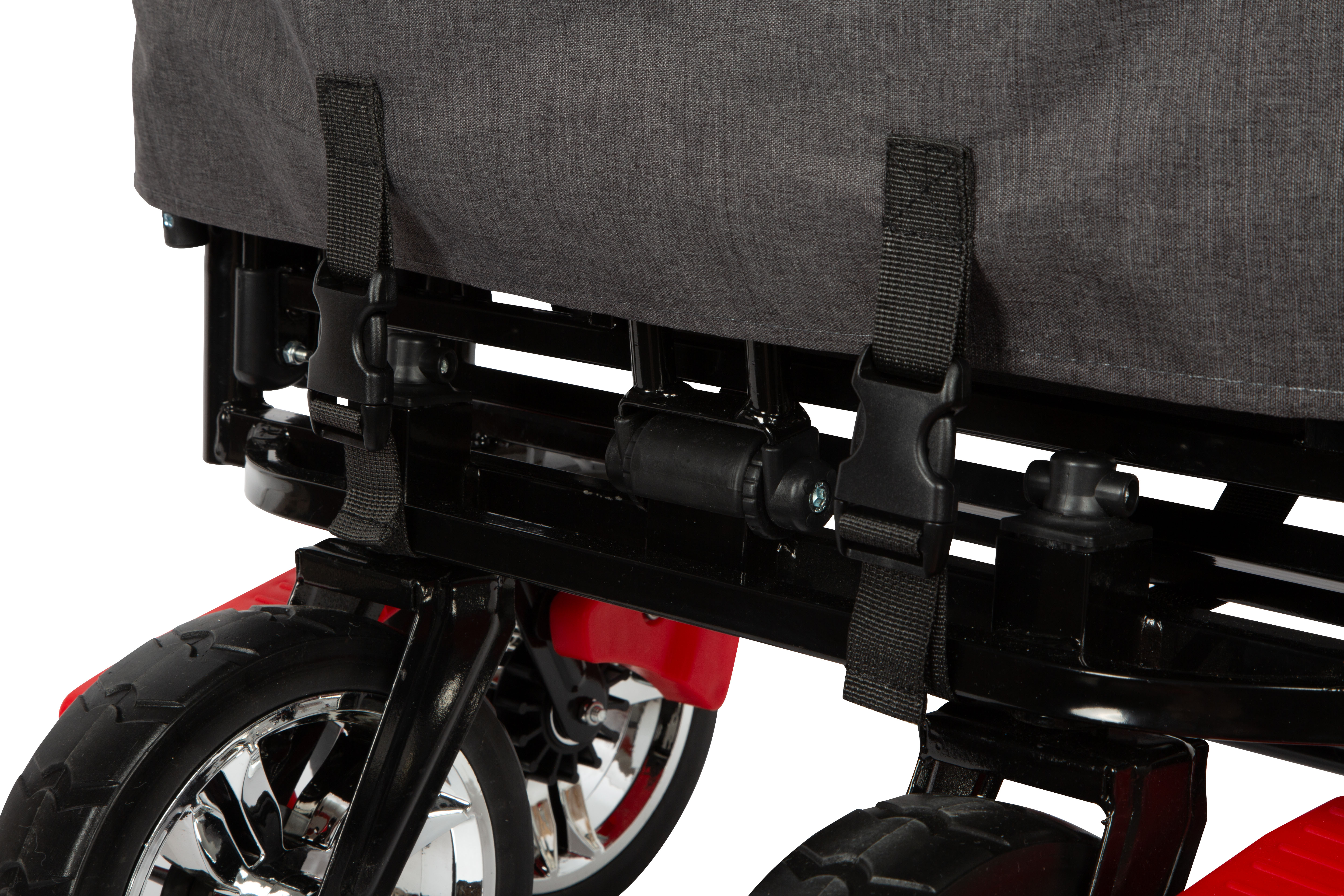 - Robuste, breite Bereifung mit verchromten Felgen und Feststellbremsen an den Vorderreifen