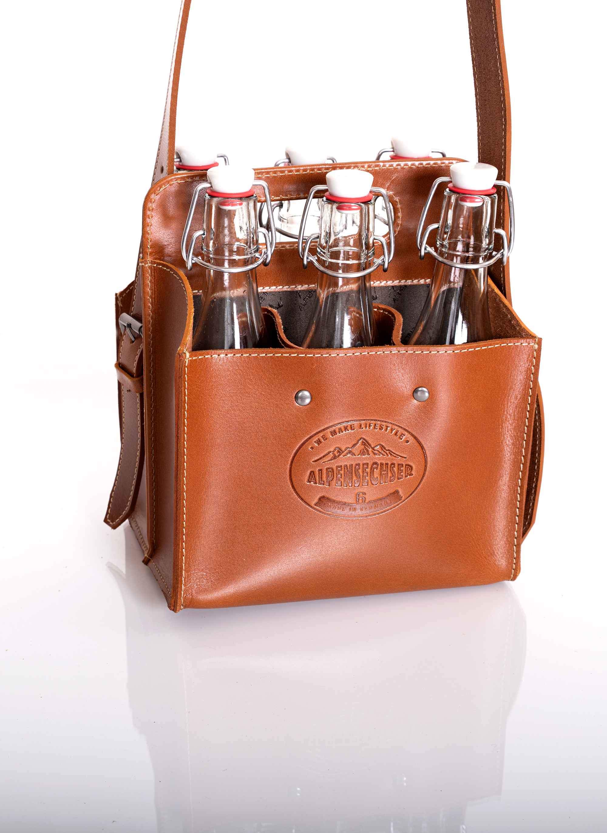 Mit unserem »ALPENSECHSER« sind Sie auf jeder Party ein gern gesehener Gast. Mit seinem stufenlos verstellbaren Tragegurt aus Vollleder transportieren Sie ganz bequem bis zu sechs Flaschen – auch über längere Strecken.