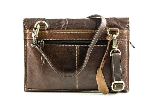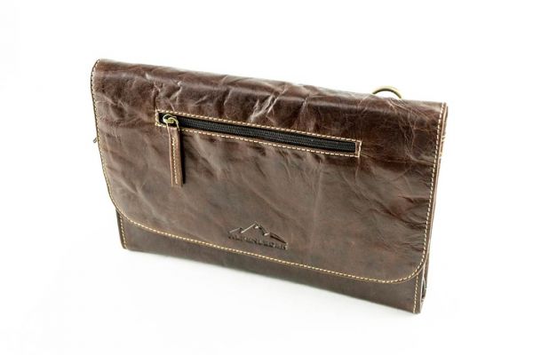 Dieser Artikel wird aus einem Stück Büffelleder gefertigt, allerdings handelt es sich bei der Farbe brandy um Büffelkalbsleder mit einer Stärke von etwa 1,8 mm, das an seiner Oberfläche mit einem Hartwachs von Hand poliert wird und dadurch einen Zwei-Ton-Effekt erhält. Durch diese Bearbeitung wird jeder Artikel zu einem Unikat. Die Metallteile an dieser Tasche sind nickelfrei.