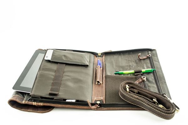 - Durch seitliche Reißverschlüsse zur Präsentationsmappe umfunktionierbar