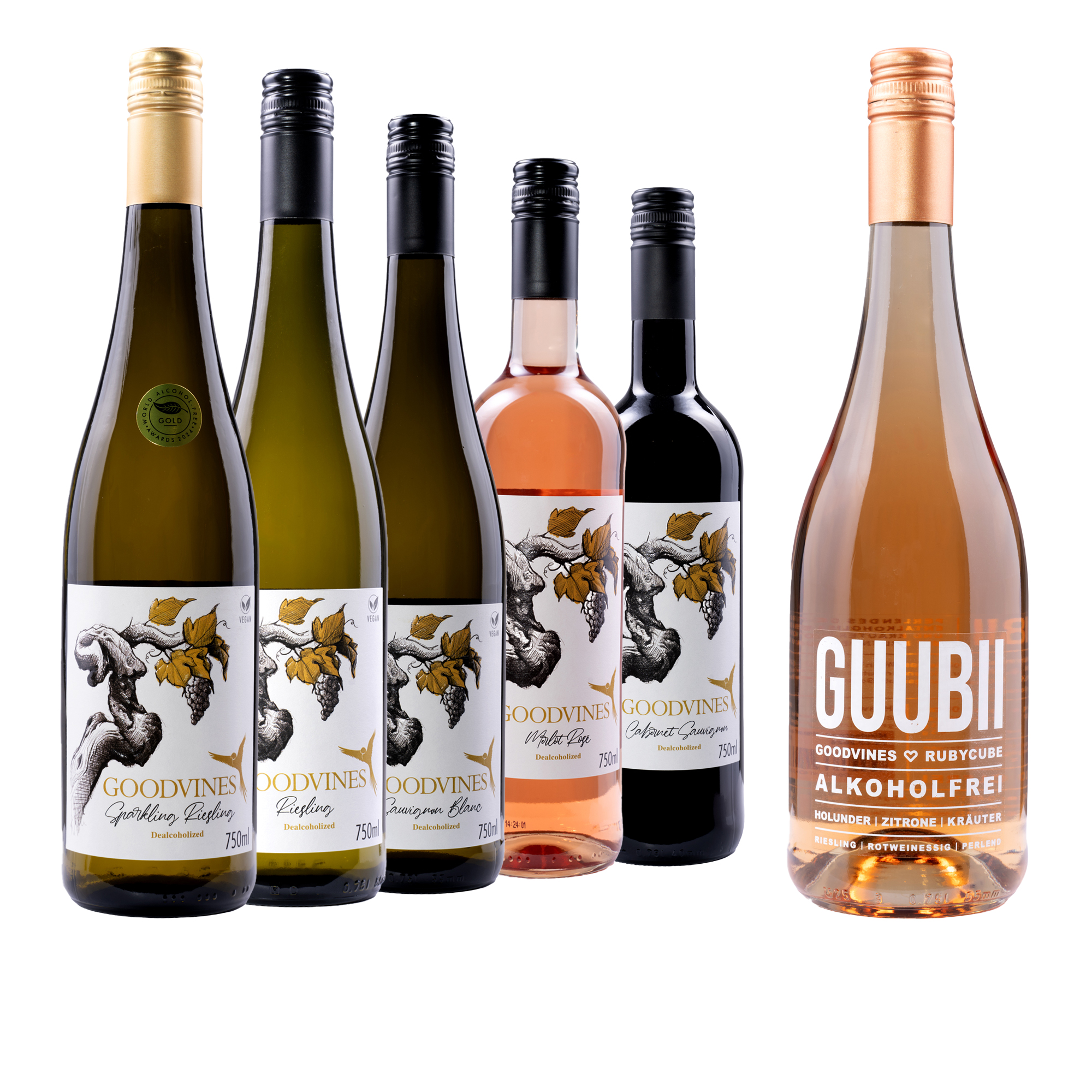 GOODVINES - sparkling Riesling, Sauvignon Blanc, Riesling, Merlot Rosé, Cabernet Sauvignon und Guubii Holunder/Zitrone - sind erlesene schonend entalkoholisierte Weine, ohne Zugabe künstlicher Aromen oder künstlichem Zucker. Ein traumhafter Genuss mit durchschnittlich nur 20 kcal/100ml.