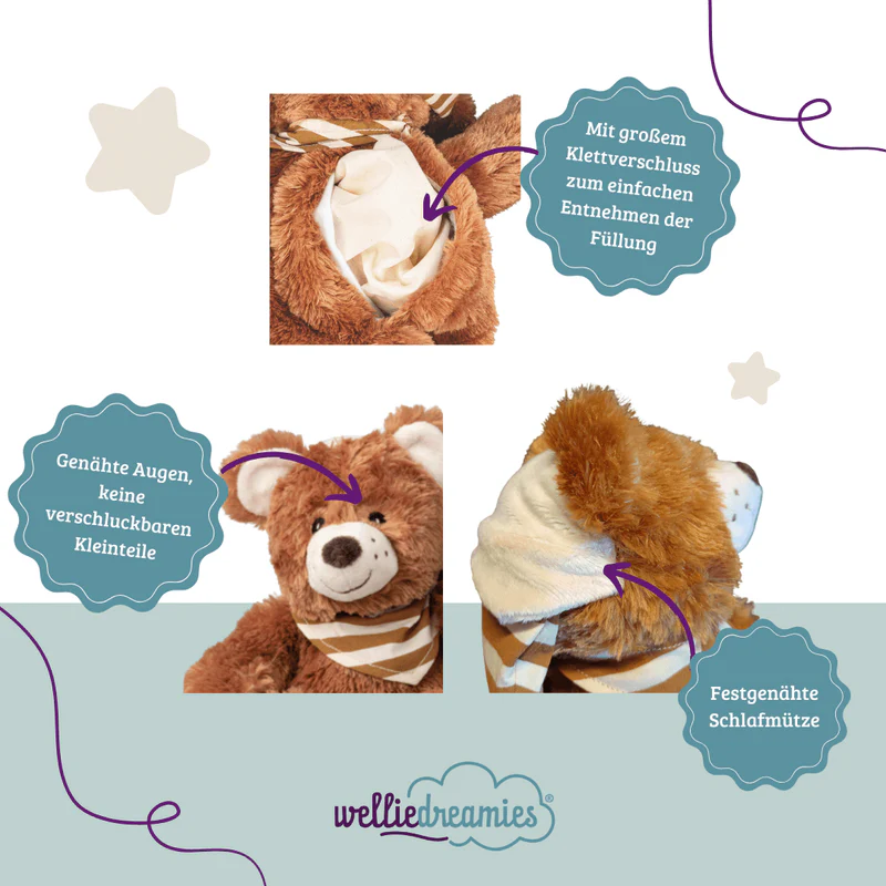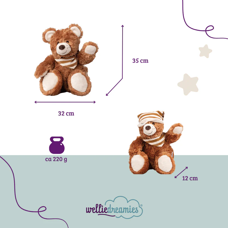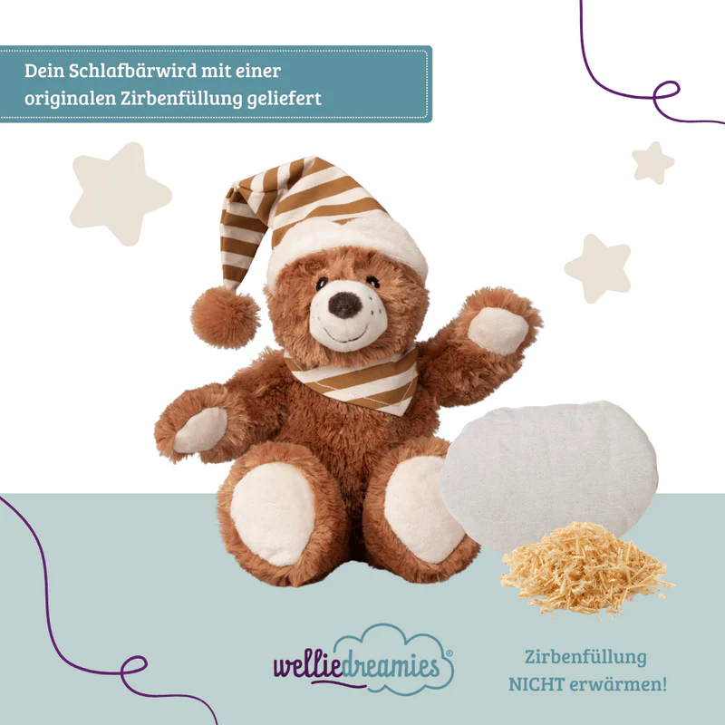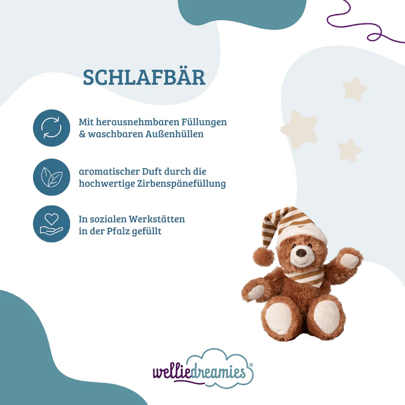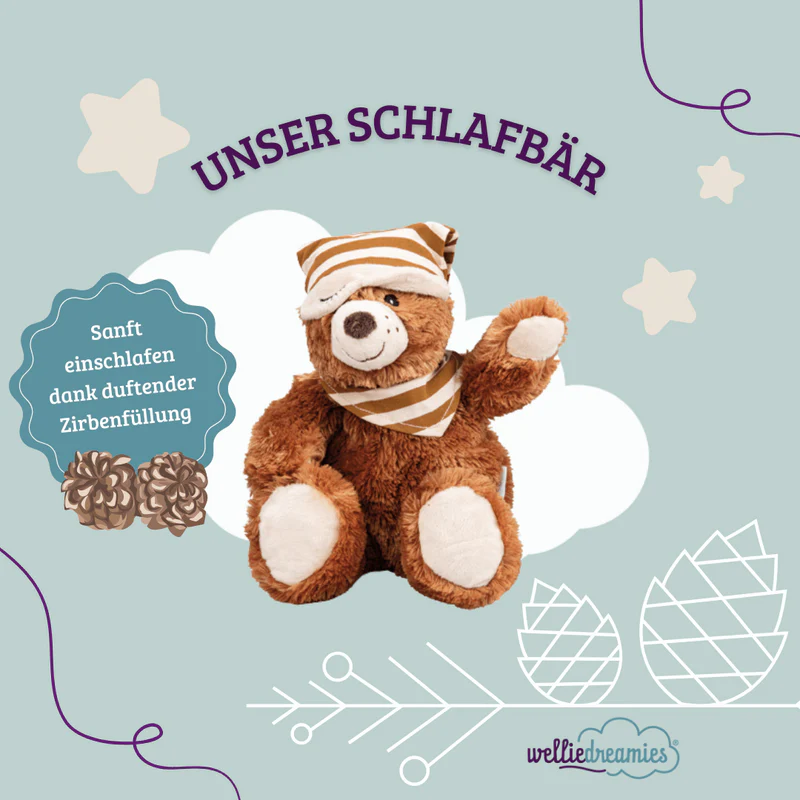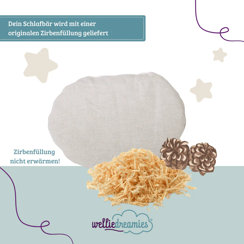 Der Schlafbär von welliedreamies® ist mehr als nur ein Kuscheltier. Gefüllt mit 100% Tiroler Zirbe, verbreitet er einen aromatischen Duft, der die Schlafqualität verbessern und das allgemeine Wohlbefinden fördern kann. Die liebevoll angenähte Schlafmütze und die praktische Schlafmaske machen ihn zu einem unverzichtbaren Begleiter für entspannte Nächte.