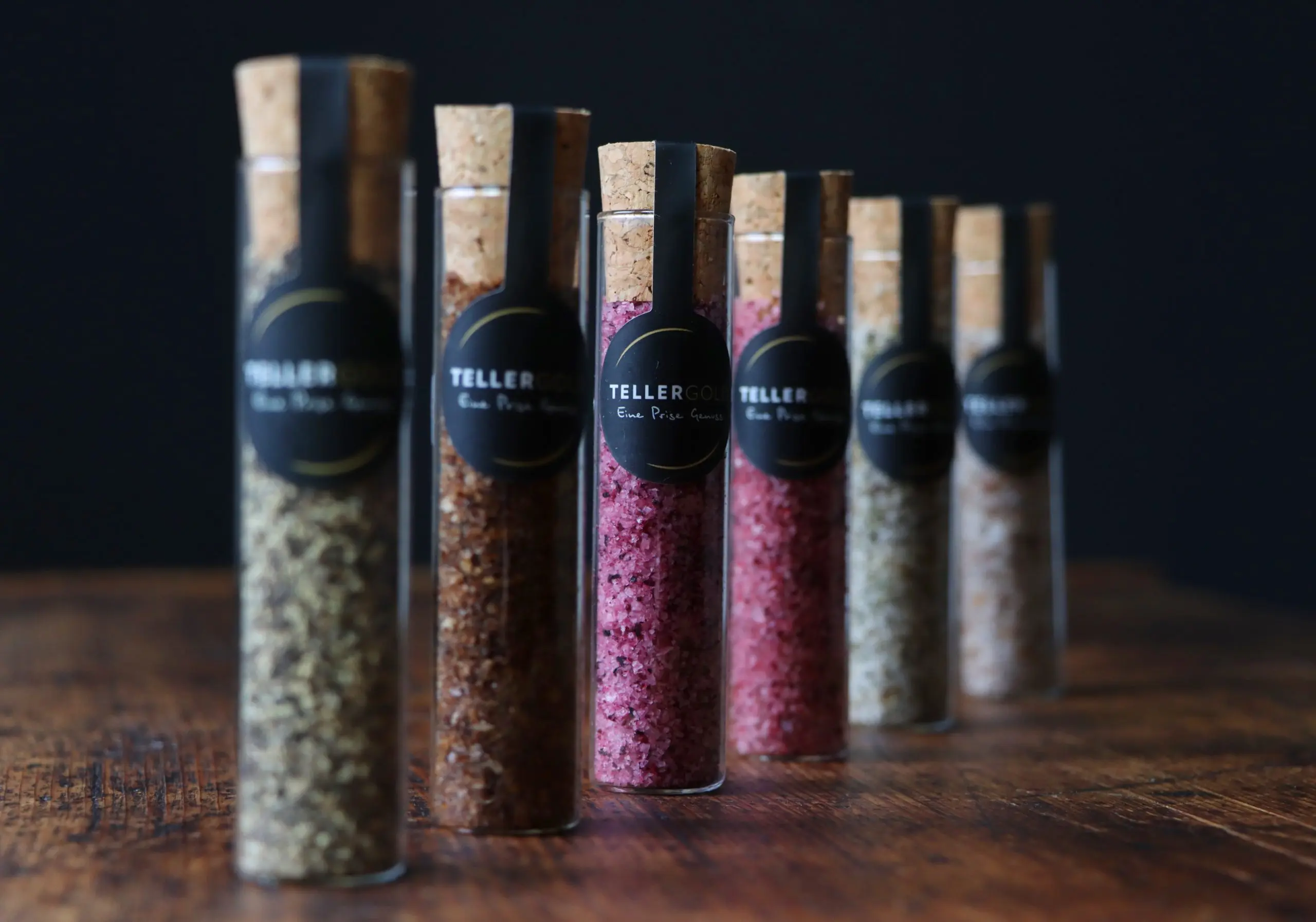 Es erwartet Sie Genuss pur aus der Mannheimer Manufaktur Tellergold! Fünf wunderbare Flor de Sal Mischungen in Handarbeit veredelt mit Karamell-Vanille, Hibiskus, Himbeer, Kräuter der Provence, Chili-Vanille sowie schwarzem Pfeffer geschrotet.