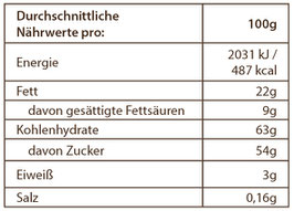 Zutaten: Rohrohrzucker, Sahne, Peru Edelschokolade dunkel (26%) (Rohrohrzucker, Kakaomasse, Kakaobutter). Kakao: mind. 70% in der Schokolade, Glukose, Haselnüsse (15%), Aprikosen getrocknet (14%), Butter, Whisky 2,9%, Vanille (0,01%), Chili (0,3%), Himbeersalz. Enthält Alkohol.